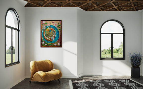 "Koi Kisses" Original with Lotus flowers , Koi and gold leaf accents in a solid Koa frame - by James Freeborne Welch. Let yourself be captivated by this zen and beautiful art piece! The price includes the 1700 Koa frame.