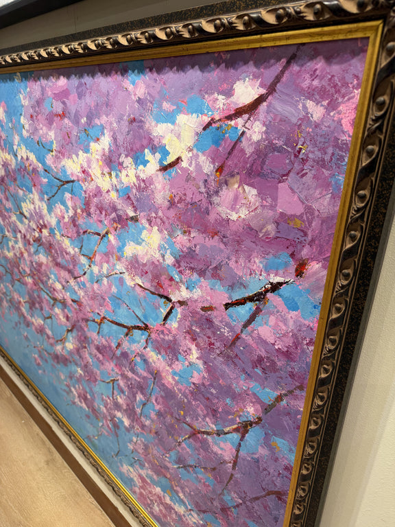 Experience the delicate and colorful cherry blossoms in full bloom with this framed original, inspired by Roman's visits to Japan during cherry blossom season. Measuring 40x60, it captures the essence of this breathtaking display.